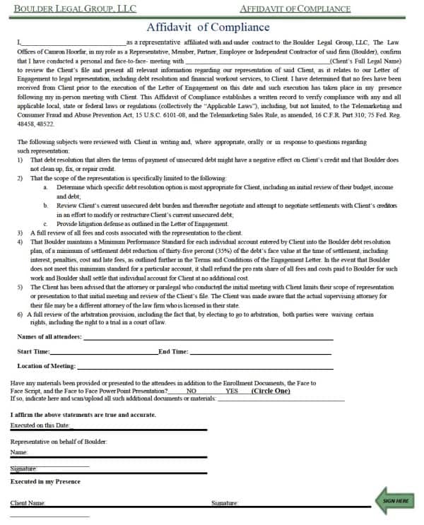 It appears the agreement includes an attempt to get around the Telemarketing Sales Rule by utilizing a face-to-face meeting with the consumer. It’s not a difficult assumption to make since the agreement says as much, “This Affidavit of Compliance establishes a written record to verify compliance with any and all applicable local, state or federal laws or regulations (collectively the “Applicable Laws”), including, but not limited, to the Telemarketing and Consumer Fraud and Abuse Prevention Act, 15 U.S.C. 6101-08, and the Telemarketing Sales Rule, as amended, 16 C.F.R. Part 310; 75 Fed. Reg. 48458, 48522.”