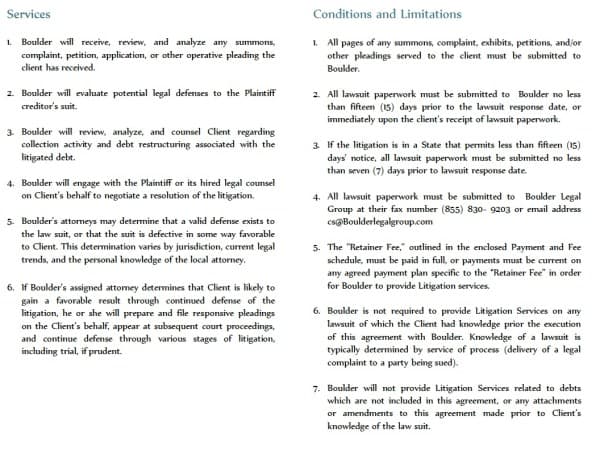 Boulder will advise and represent Clients in their defense of litigation initiated by creditors or collectors to recover debts listed in this agreement. Boulder attorneys are immediately notified of litigation, and may be assigned to address any litigation served on Client after the effective date of this agreement. Litigation services are further conditioned and limited by other terms of this agreement, circumstances of practicality, and jurisdictional rules.