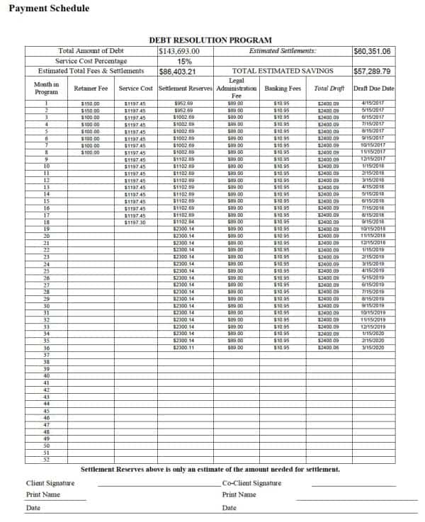 The client agreement says the services that will be performed are, “Pursuant to this agreement’s terms, Boulder will assist you with the resolution of burdensome debt, and as such, the Representation contemplated in this Agreement is referred to as a Debt Resolution Program. In return for Boulder’s services, you agree to pay specific amounts to Boulder, as specified in this Agreement and its enclosures.”