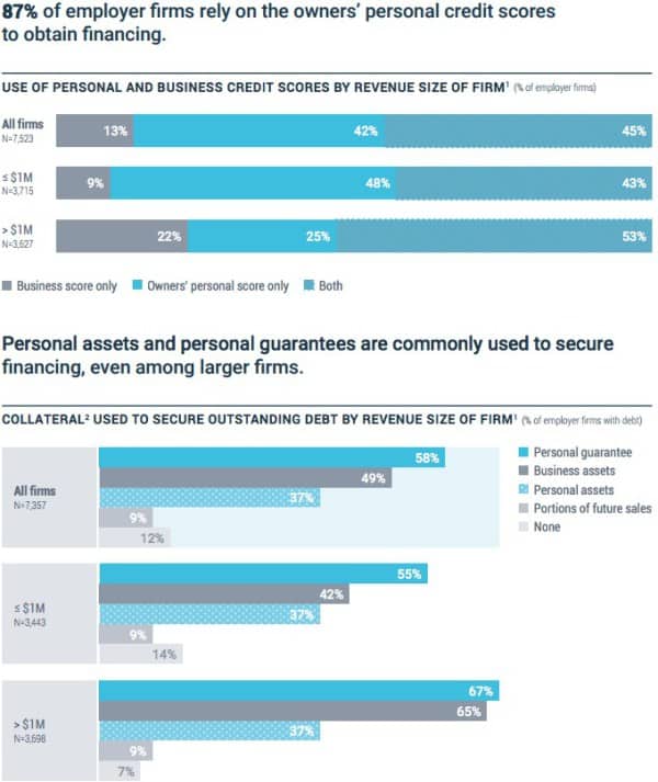 - More dependent on personal finances (25% relied on personal finances and 48% relied exclusively on a personal credit score) compared to larger firms (11% and 25%, respectively).