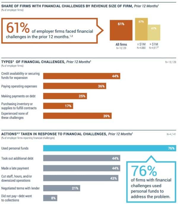 - The vast majority of firms addressed financial challenges by using personal finances (76%) before taking on additional debt (44%). Most also relied on the owners’ personal credit scores to obtain financing (87%).