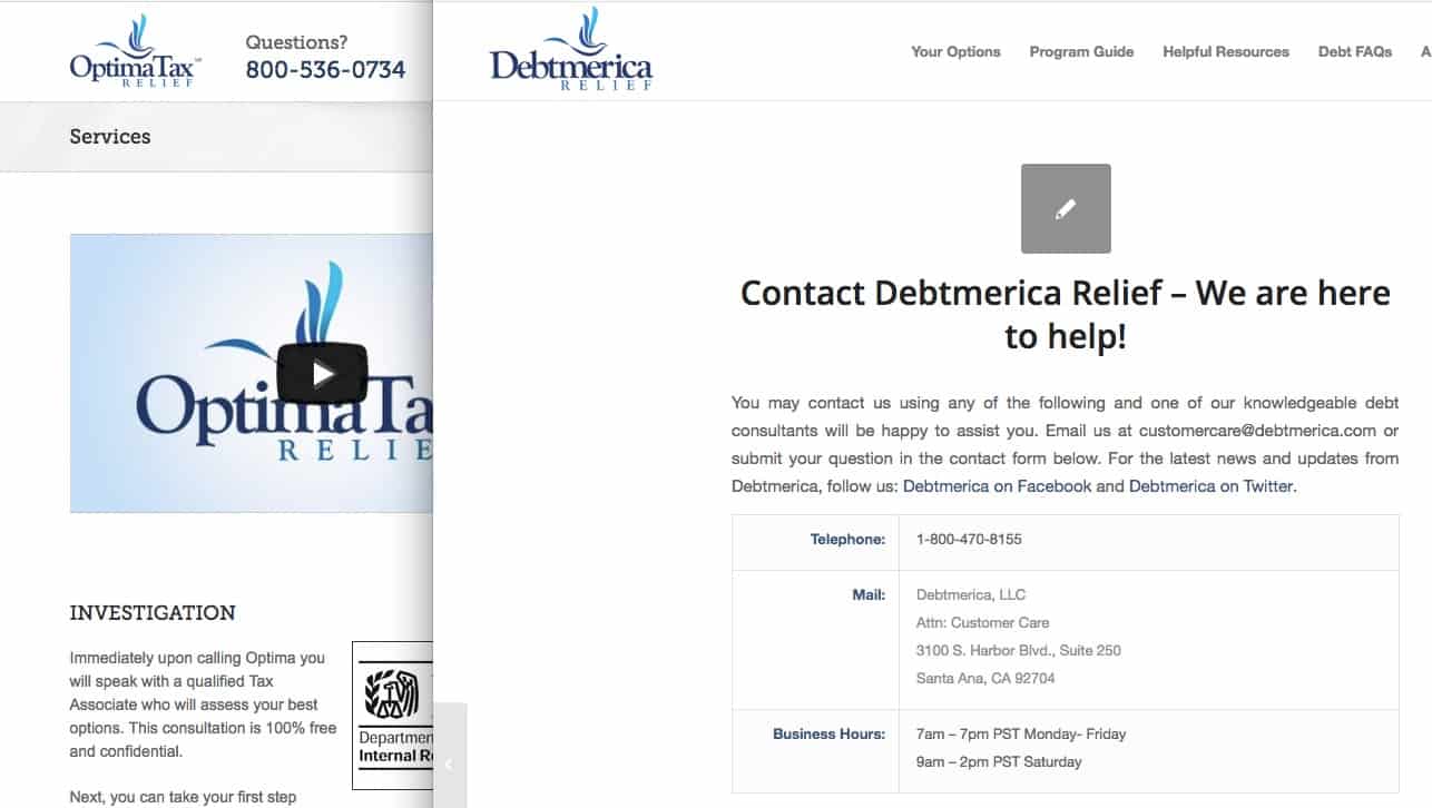 The only question raised in my quick look is Optima Tax Relief and Tax Relief Partners appear to be related and provide duplicate solutions. Not sure exactly why that is. They are both located at the same street address and Debtmerica Relief says they are located at the same street and suite as Optima Tax Relief. They appear to use the same logo image as well.