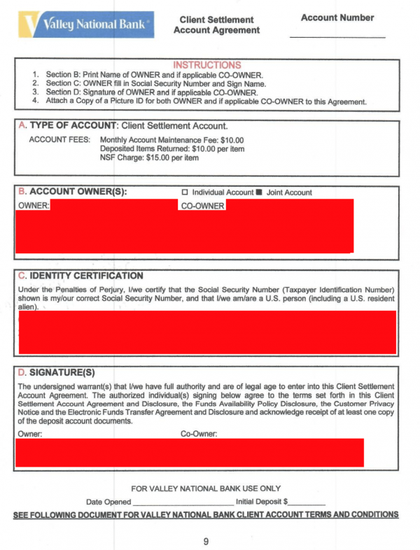 Judging by the bank representative call, it would appear Valley National Bank acted as if DNS was the entity in charge of the bank account.