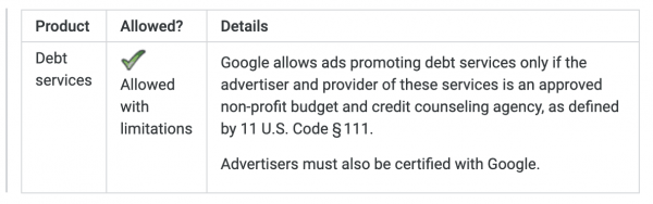 To recap, the new Google Adsense debt relief advertising policy states that to even be eligible to apply for debt relief advertising in the United States the company “will need to be registered, licensed, or approved by the relevant regulatory authorities or recognized professional bodies in the country or countries they are targeting.” – Source