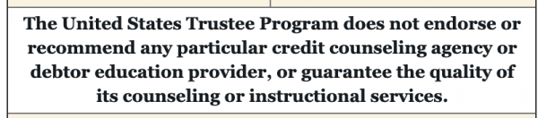 Additionally, they will need to be approved by the Department of Justice credit counseling or debtor education program managed by the United States Trustee Program.