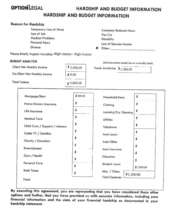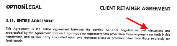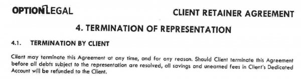 That’s not something Option 1 Legal might have in their client agreement, which I have not seen, but it is a very common part of many debt relief agreements I have reviewed from many companies.