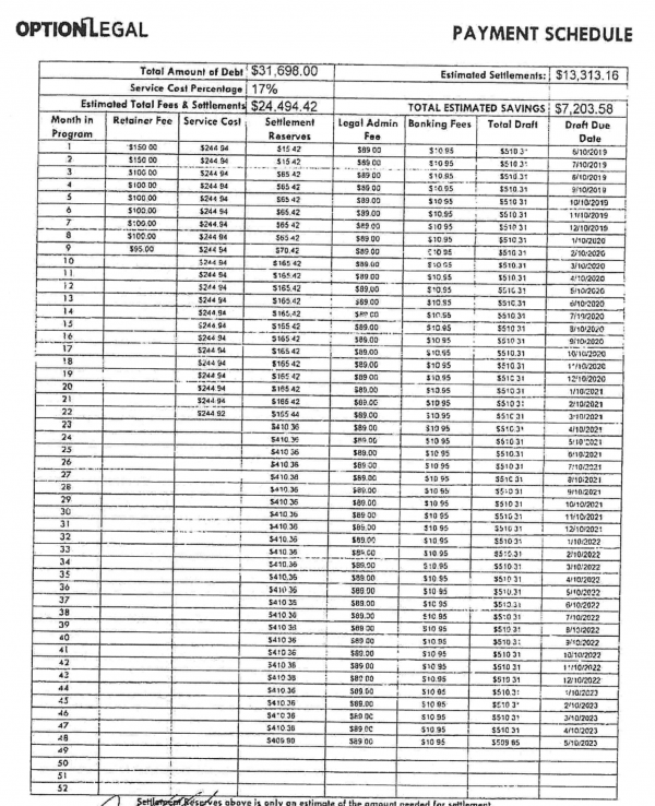 I agree with these comments. I was with option one legal for three years. I was supposed to be out of debt in 3 1/2 years. I paid and paid and paid. They negotiated with five of my debtors but the largest debtors were not even touched. When I called and asked to get these debts at least working, i was told it would take more money. I told them i would not pay anymore money until they had a settlement from one of those debtors on the table. They already had over $1,100 in my account and nothing was being done except collecting my money.