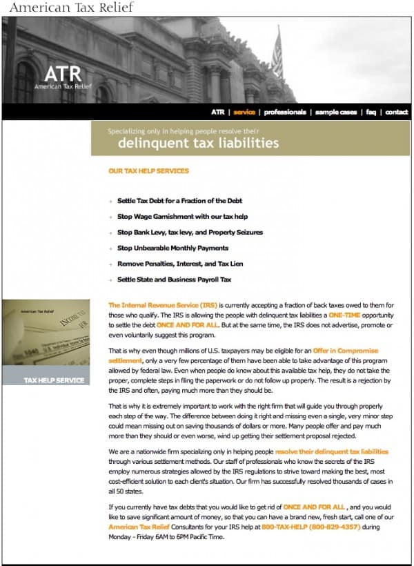 These guys use the same business model as many debt settlement companies and in fact you will find that behind the scenes there are some pretty incestuous relationships between a lot of the tax relief companies and debt settlement companies. The common thread is commissioned sales people selling something they don’t understand and getting the obvious result of piss poor performance for their clients who really never stood a shot at success from the outset.