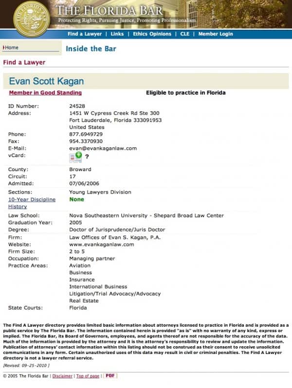 The email also contains a link “To Verify Attorney Credentials With The State Bar Association Click Here.” The link takes you to the credential page of Evan Kagan.