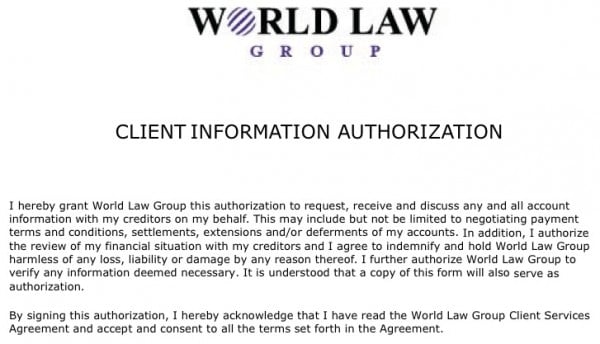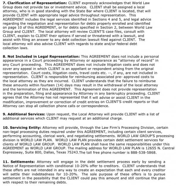- If the client manages to settle a debt directly with one of their creditors if contacted by the creditor then the client will still owe the fee to World Law Group. It also makes the statement that “Attorney hereby advises CLIENT not to resolve their debts directly with creditors.”