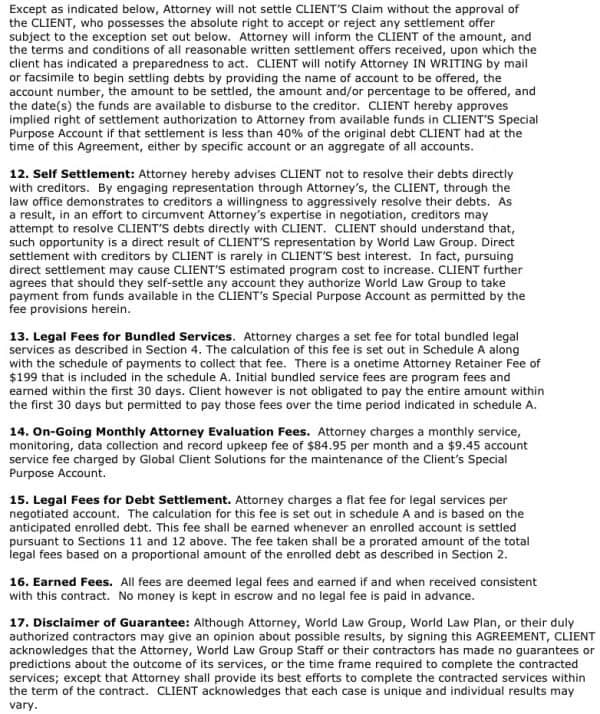 - Client agrees to reimburse World Law Group for all fees earned per sections 13, 14, 15, and 16. Those fees are legal fees for bundled services, on-going monthly attorney evaluation fees at $84.95 per month, legal fees for debt settlement, and earned fees.