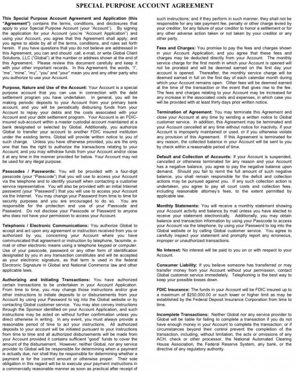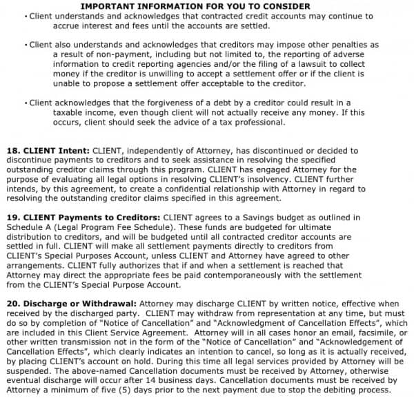 - The agreement says that the client “independently of Attorney, has discontinued or decided to discontinue payments to creditors.” Yet it is part of nearly all debt settlement sales pitches that the consumer is told to stop making their payments.