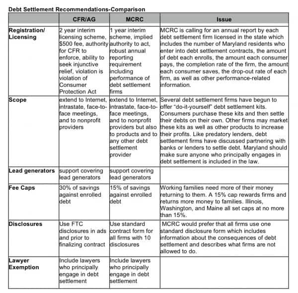The Maryland Consumer Rights Coalition today released its recommendations for better regulation of the debt settlement industry. The recommendations are in conjunction with those from the Maryland Office of the Attorney General and the Maryland Office of the Commissioner of Financial Regulation, which MCRC feels do not go far enough. (Read report/recommendations here, including the story of a Marylander who lost thousands of dollars after dealing with a debt settlement company. MCRC can provide her contact information.)