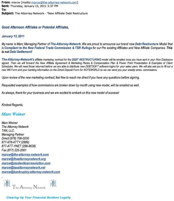 More than one tipster (send in your tips here) sent in the following email. In itself it is not all that newsy but what struck me is that it was only one month ago that The Attorney Network was bragging about their wonderful affiliate program. See Goooood Mooooorning….Potential Affiliates. The Attorney Network.