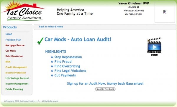 A tipster (send in your tips here) sent in an email they received from 1st Choice Family Solutions regarding their auto loan audit / car modification program. According to the video on the linked site below the service costs $599.