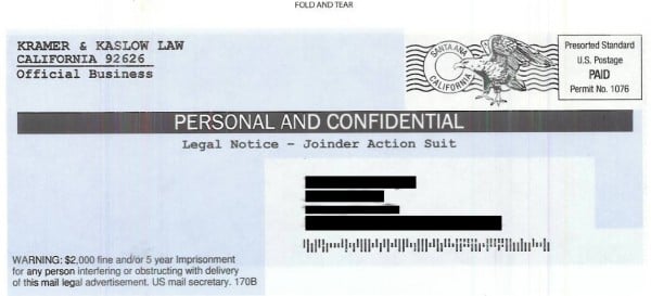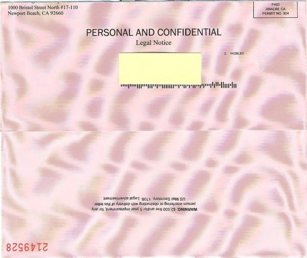 I am unaware if the mailer was sent out by a law firm. It does not seem to comply or contain advertising disclaimers typically or required to be used in California regarding legal service advertising. – Source
