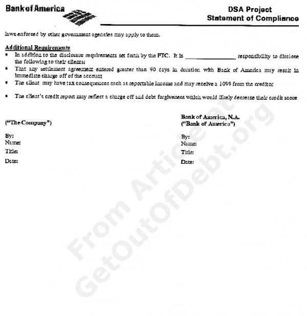 It appears that the Bank of America debt settlement statement companies must sign may pose a problem to certain legal model debt settlement companies.