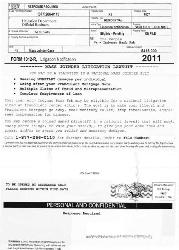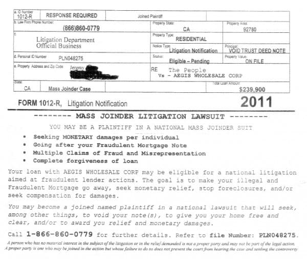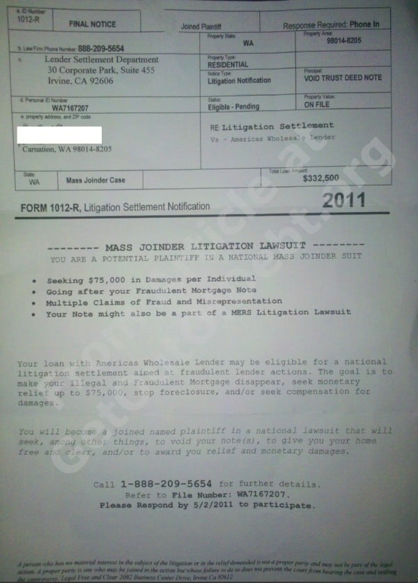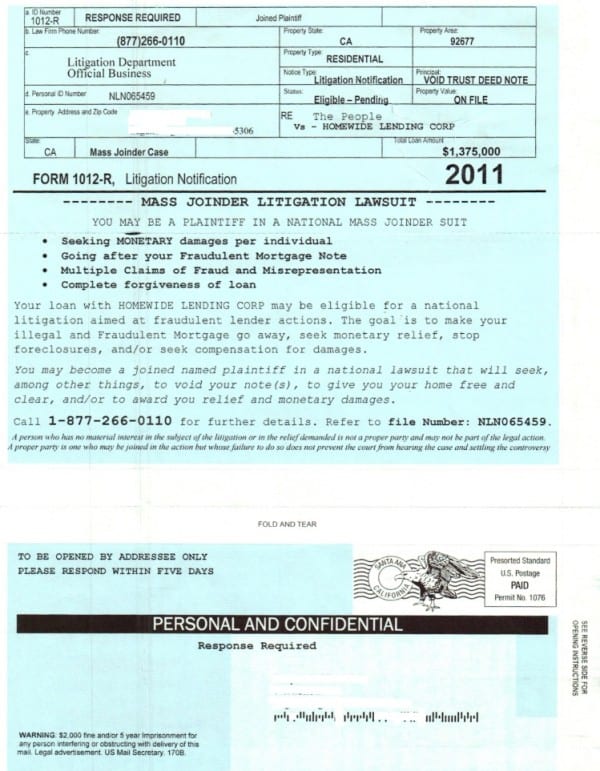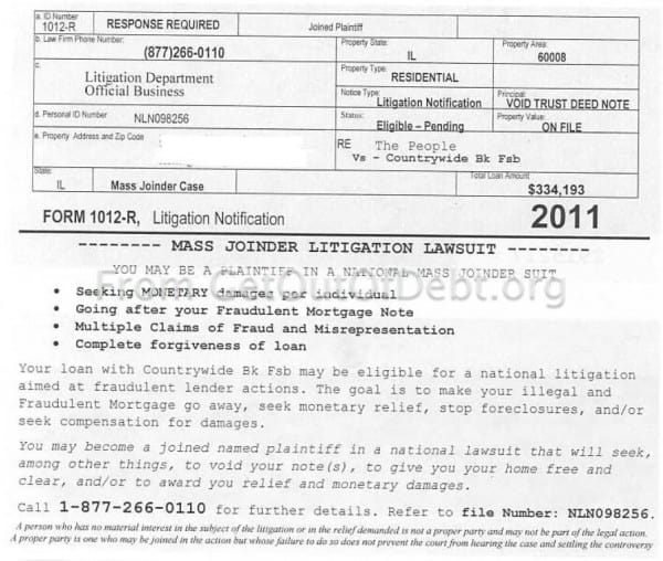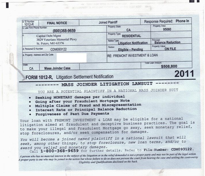 I received a form 1012-R from Civil Litigation Department 1000 Bristol Street North #17-110 Newport Beach, CA. 92660; the notice instructed me to call 1-800-985-5261 for further details; i called the number and and then arranged for me to speak to a person whose name was David Hamilton who works for Brookstone law as a client service representative and his contact number is 1-800-946-8655 Ext. 445; he explained what their law firm does and convinced me to send a copy of one of my home loans and proof of title to my residence as one of their requirements to qualify for the Mass Joinder litigation lawsuit. He discussed the Paul Ronald vs. Bank of America and Wright vs. Bank of America case with me. After speaking to him, he then instructed me that another person from brookstone law firm will contact me in an hour or two. Soon enough, a Carl Centerfold ( i’m not sure how he spells his name), who works in the quality control department for Brookstone law, contacted me and ask me more questions