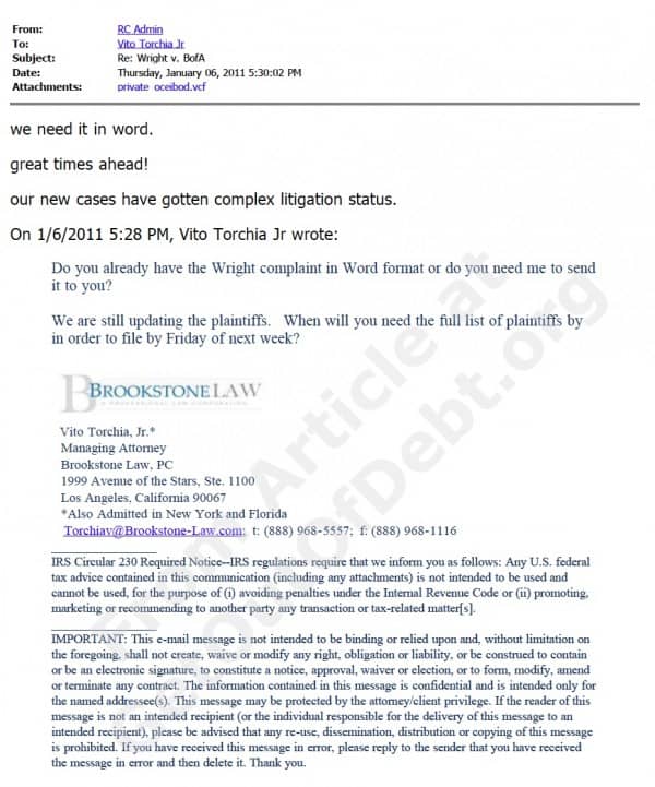 Then you have Brookstone Law, and I asked Stein directly if Brookstone was authorized. I also pointed out to Stein an affiliate pay schedule that was posted by an affiliate and claimed to pay commission on the B of A case. At the time, Brookstone was openly claiming to represent the Stein case, and since Stein’s website did not claim that Brookstone was or was not authorized, I think it was a fair question. Please note that according to Stein’s email to Brookstone, Stein wanted an accounting of all retainers and funds collected, and asserted that he believed there were about 90 clients that signed up through Brookstone (unsure whether that was for Ronald or Wright).