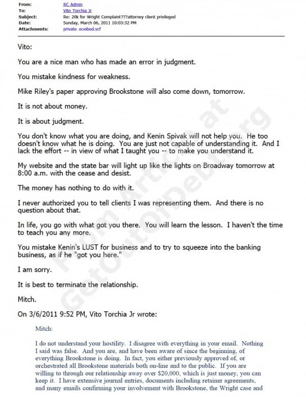 Yes, the two strategies that Vito uses in public forums is to either deny that Damian Kutzner runs Brookstone Law or to ignore it by not making any comment in regards to the matter at all. The fact that Damian Kutzner runs Brookstone Law is a very serious matter (as acknowledged by many former employees “independent contractors” of Brookstone Law – United Law Group). It automatically make everything that happens at Brookstone law illegal because Damian is not allowed to be involved with any type of firm or company that uses telephones to solicit clients. Not to mention the fact that he was the one who ran United Law Group (now referred to as Brookstone Law) which recently got shut down by the FBI for stealing money from homeowners.