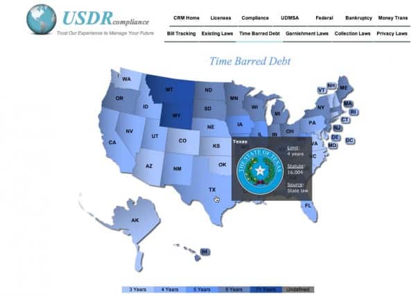 When you scroll over a state, in this example, Texas, a visual clue pops up showing you the SOL and if you click on the state it takes you to the current regulation/legislation that covers this for the state.