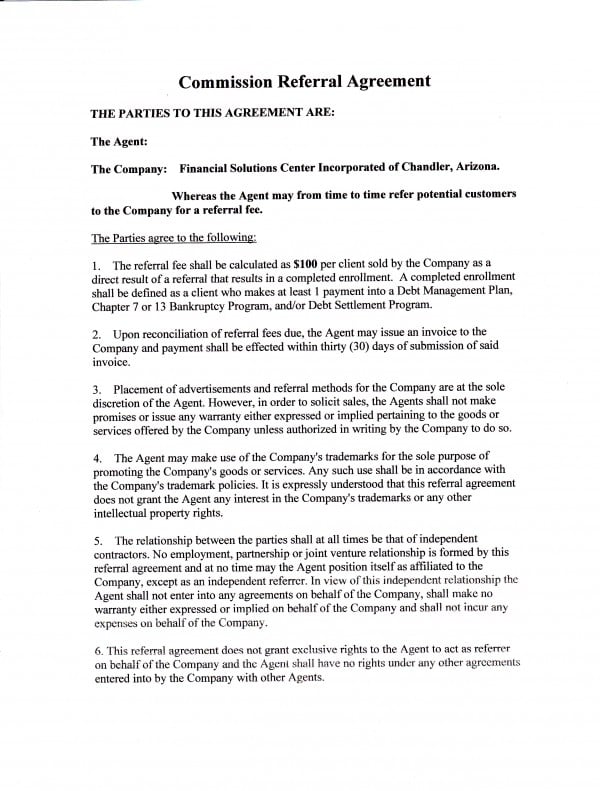 And for the life of me I can’t figure out why your wife, as a debtor needing help, was given the commission referral agreement from Financial Solutions Center that you sent me below.