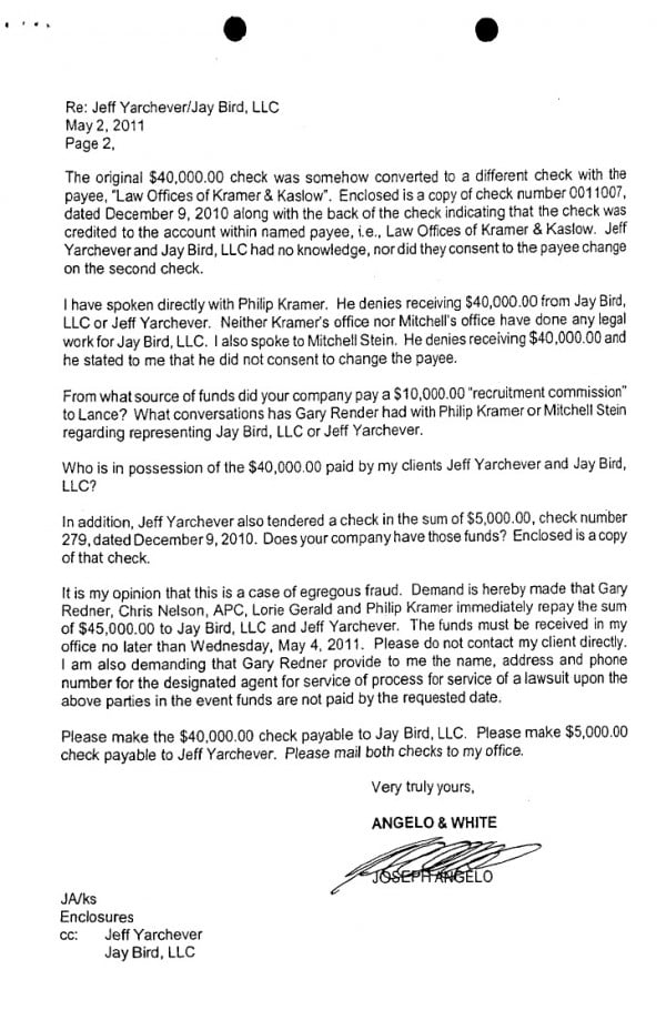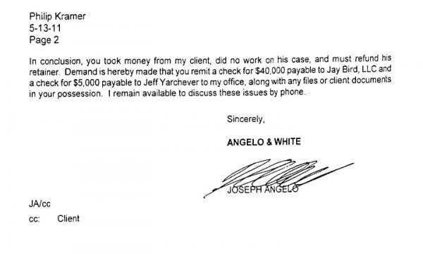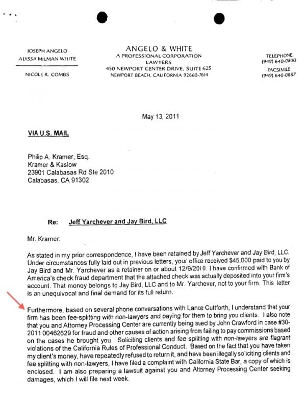 This letter in particular is interesting in that Philip Kramer is accused of illegal fee splitting by another lawyer who also filed a complaint with the California Bar against him.