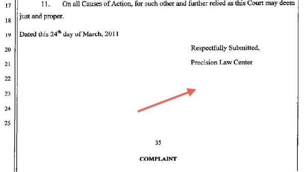 The Precision law Center website shows a list of cases on their home page they claim to have filed. I took a look at the first case on the list. Ann Easley v. Bank of America, or at least the court filing as they show it. – Source