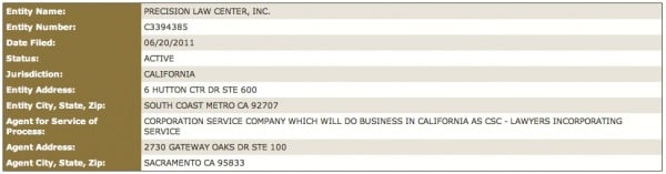 According to State of California corporate records Precision Law Center is not a professional law corporation and was only just registered to do business on April 22, 2011.