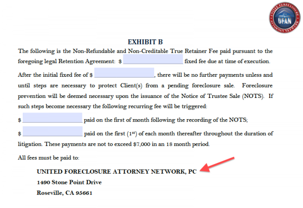 Got it. Thanks. I did a quick look at the agreement and one page in particular caught my eye.The page says that payments are supposed to be paid to United Foreclosure Attorney Network, PC but a search of California Corporations could not find any company registered to do business under that name. Certainly not great attention to detail on their part.