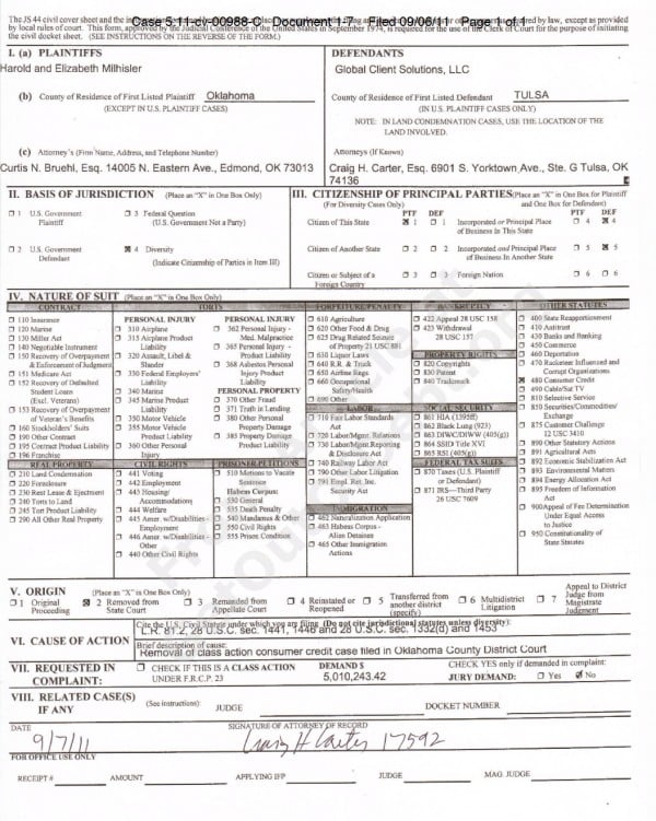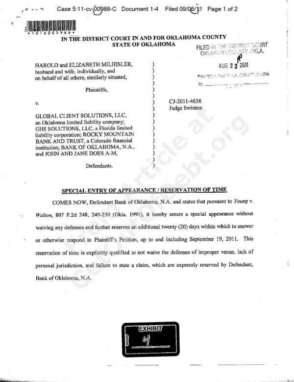 This case is Milhisler v. Global Client Solutions, GHS Solutions, Rocky Mountain Bank & Trust, and Bank of Oklahoma is a class action case.