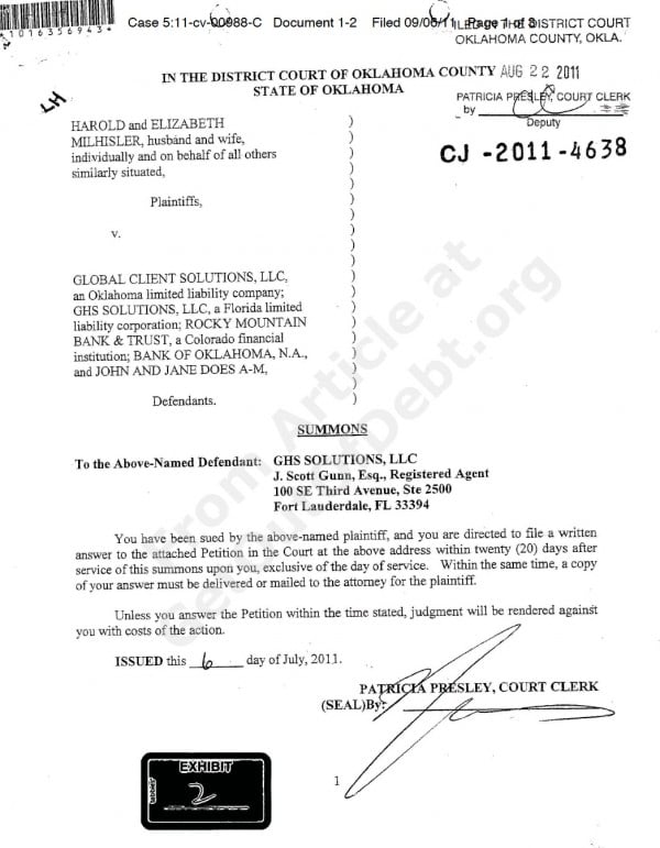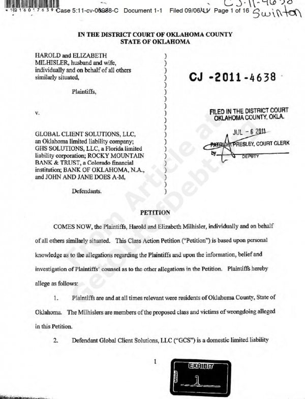 GHS sold debt settlement services to Oklahoma residents that are said to be illegal, usury in nature, and violate the Oklahoma debt pooling statutes.