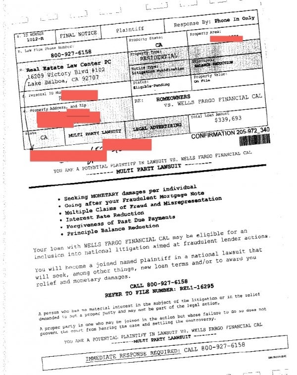 Reader just sent in attached mailer they received. The mailer came with a cover page from a case filed by Real Estate Law Center. Can you give us an update on the case BC463386 and which lender it is against?
