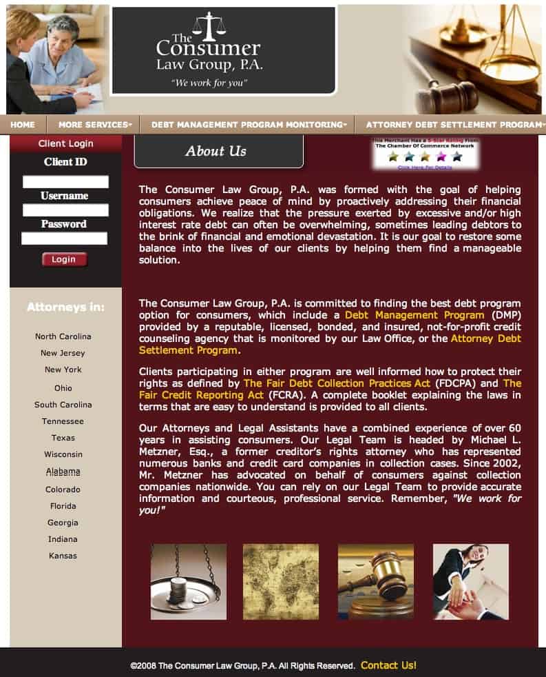 Consumer Law Group sold debt settlement services and required advance fees for services before debt settlement services were rendered. Additionally they are said to have misled and/or deceived the public that debt settlement or debt management are services that they are able to provide as a law firm.