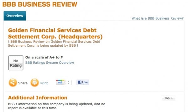The article came to the attention of the BBB who apparently decided they were going to take some sort of action. According to the new BBB page for them, “! BBB Business Review on Golden Financial Services Debt Settlement Corp. is being updated by BBB !”