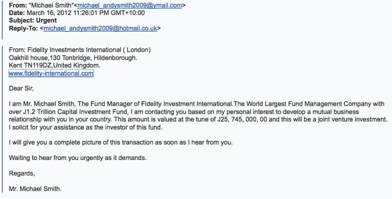 I contacted the company and Peter Yandle, a spokesperson for Fidelity Worldwide Investments said, “Thank you for forwarding to me the scam email that you received which made out that it was from someone at Fidelity. As you will be aware, there are many people who use the internet in an attempt to carry out fraud. It is clear from the poor standard of English, the email address from which it was sent and the content of the email that it was not a genuine communication from an international investment firm.”