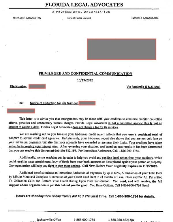 A great reader sent in a copy of a fax that was received from Florida Legal Advocates which claims to be located in Florida at a Jacksonville office.