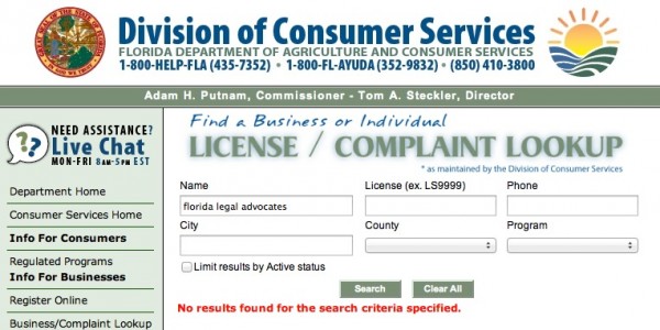 Your website is erroneously listing my company, Florida Legal Advocates, in being involved in deceptive business practices. The company you ha ve listed on your site is the old Florida Legal Advocates which is located in Jacksonville, Florida and has not been registered under the Division of Corporations for the state of Florida.
